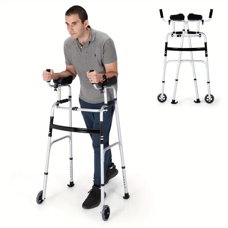 This folding walker with wheels provides stable and comfortable mobility assistance for users requiring extra support during walking. Constructed from high-quality aluminum alloy, it offers excellent durability and a strong weight capacity of up to 330 lbs. The ergonomic arm support pads help maintain body balance, while adjustable armrests and legs accommodate users of different heights.